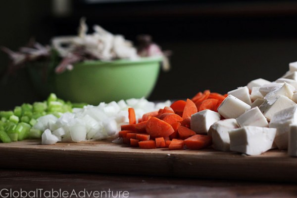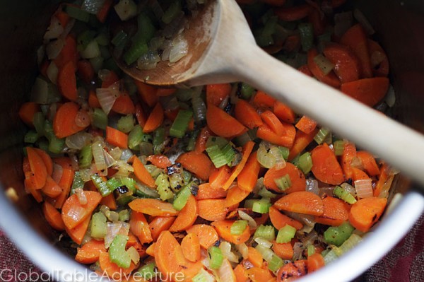 Next, get cooking. First, saute the onions, carrots, and celery in a bit of oil until softened and slightly browned.
