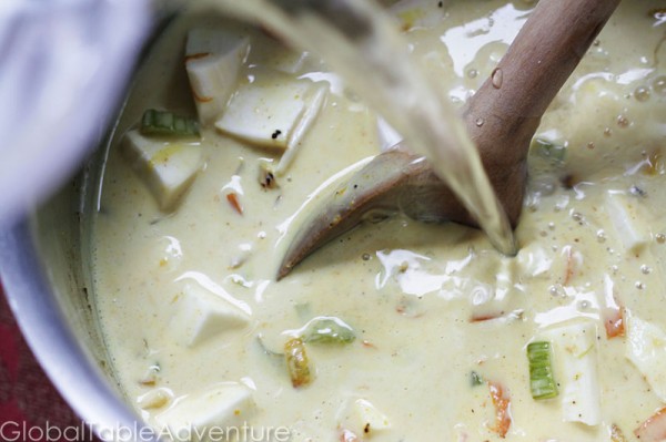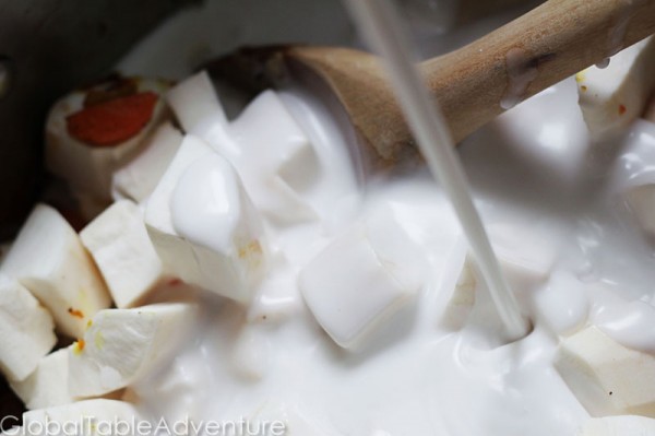 - Add the creamy, silky coconut milk, yucca, and water.