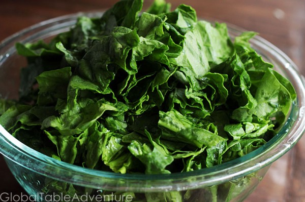 Simmer uncovered for about thirty minutes, then add as much spinach as you can handle. I went for a few handfuls from this bowl.