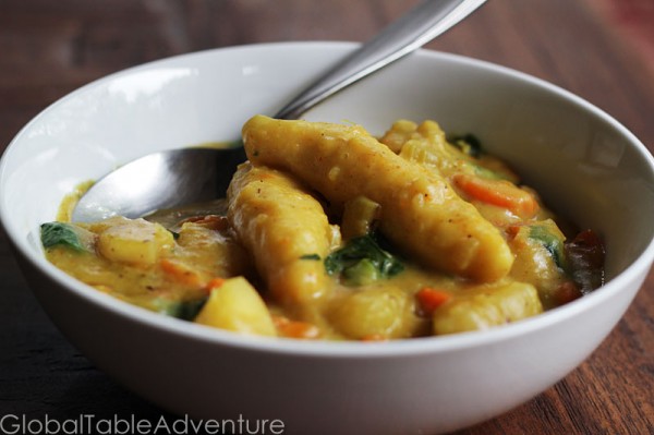 Stressed out? Time for a Caribbean Oil Down – and I don’t mean massage. This heavy duty dish is made by stewing cassava or bread fruit in coconut milk and curry. The result is a thick, indulgent stew worthy of any party. Our version is vegan, but pork bits are typical. With such rich ingredients, Oil Down seems more suited to a ski slope than a beach party, but, still, Grenadians eat this dish in their bathing suits.