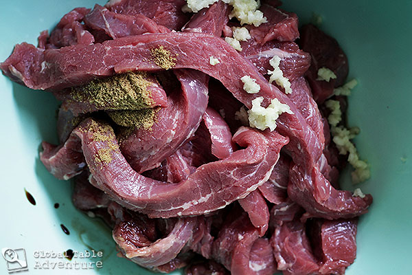 - Marinate strips of meat in vinegar, soy sauce, garlic, cumin, salt and pepper. You can cover this and refrigerate overnight if desired. Or just do a quick marinade for 30 minutes.