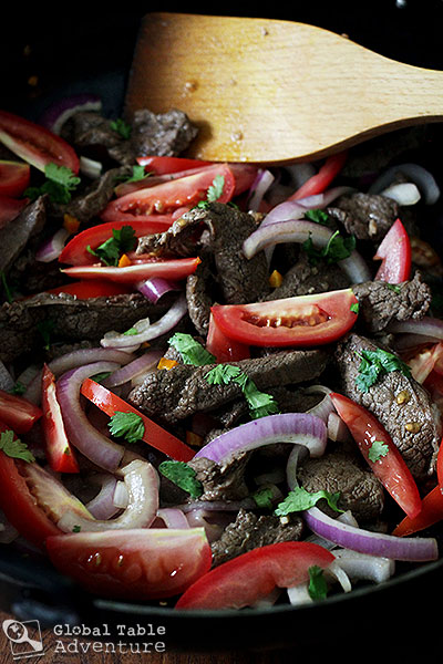 - Squeeze the meat dry from the marinade and fry in a little oil an extremely hot wok or pan until browned. Be careful not to overcook. Note – If your pan isn’t screaming hot, the meat with simply stew in it’s juices. An alternative is to add the soy sauce and vinegar after frying, although I like the added flavor gained from marinating it. Peruvians do it both ways, depending on the household.