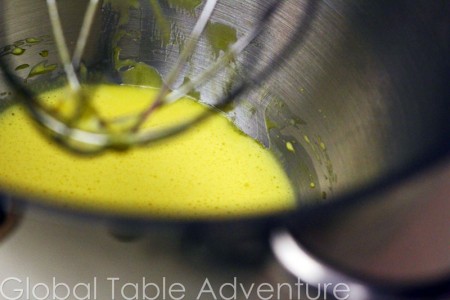 Add the dry ingredients to egg yolks in three parts, mixing in the orange juice in between.