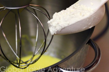 4. Add dry ingredients to egg yolks in three parts, mixing the orange juice in between. If the dough seems sticky, add extra cornstarch one tablespoon at a time, until the dough comes together and is no longer sticky.