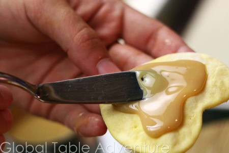 While Alfajores (cookie and dulce de leche “sandwiches”) are made throughout South America, the Chilean version is unusual both in technique and presentation. They use an egg-based dough (in other countries shortbread is favored). In addition, Chileans only roll one side of the dough, which results in a curled leaf effect on the dough as it bakes.