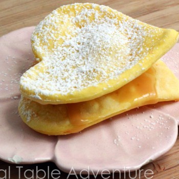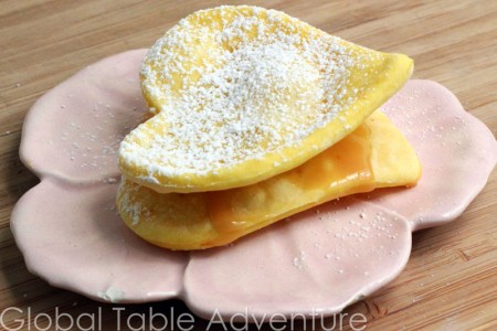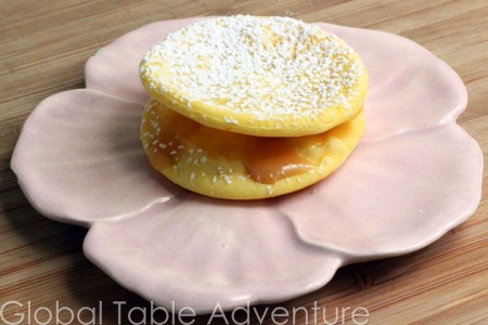While Alfajores (cookie and dulce de leche “sandwiches”) are made throughout South America, the Chilean version is unusual both in technique and presentation. They use an egg-based dough (in other countries shortbread is favored). In addition, Chileans only roll one side of the dough, which results in a curled leaf effect on the dough as it bakes.