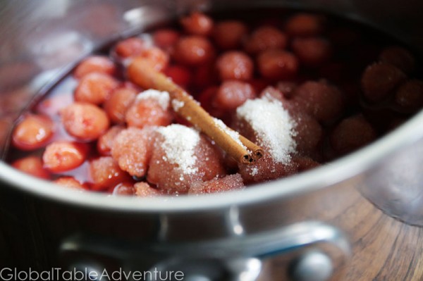 - Add the cherries, their juices, sugar, red wine, and cinnamon stick to a medium pot. Bring to a gentle simmer for about 10 minutes.