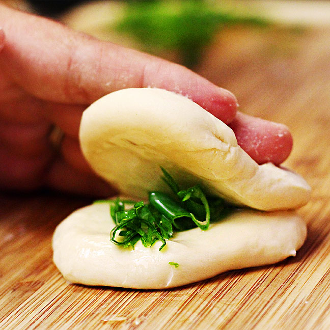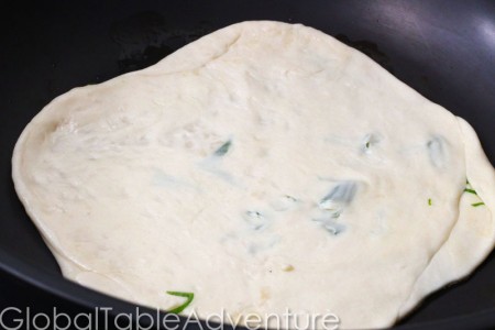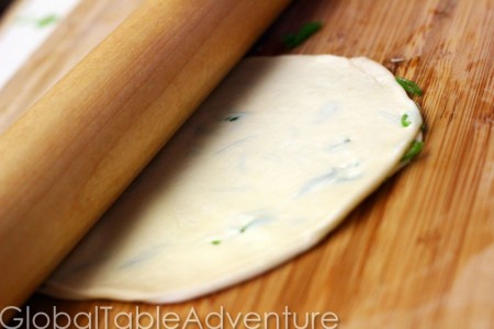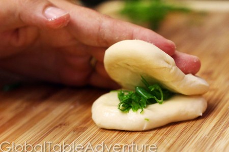 - Make small balls of dough (you need two at a time). Press them flat with the palm of your hand. Drizzle fairly liberally with sesame oil (or whatever oil you happen to have – but sesame oil tastes grand!). Spread it evenly around by rubbing the two discs together. Sprinkle with a bit of green onion and press the two discs together. Roll thin. At first it will be slippery and the discs will want to separate. Once it gets a bit thinner, the dough will start to stick and hold together better.