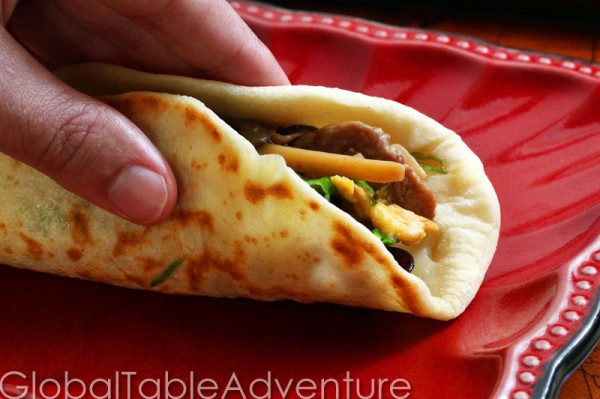 - Place in a medium-hot pan with a bit of oil. Cover and let cook a couple of minutes, or until light golden brown. Flip and cover again. When they come out of the pan you’ll be able to separate the two pancakes from each other! Wicked cool. Fold in quarters and serve alongside your favorite stir-fry, like Mu Shoo Pork.