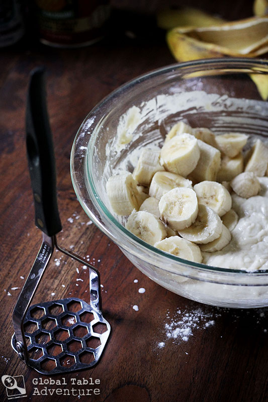 - Meanwhile, whisk together the batter ingredients. Add the chopped bananas and mash together with a potato masher or similar.