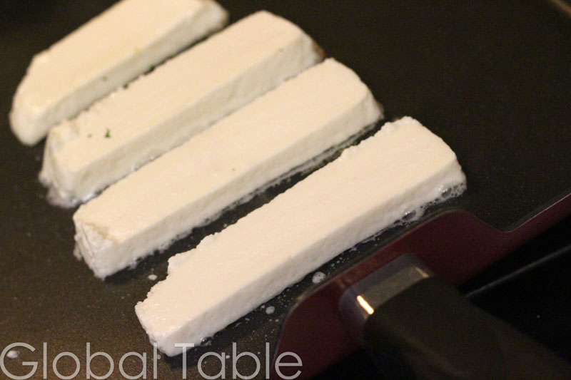 - Meanwhile, fry cheese in a skillet over medium heat until both sides are golden brown (or darker, depending on your preferences)