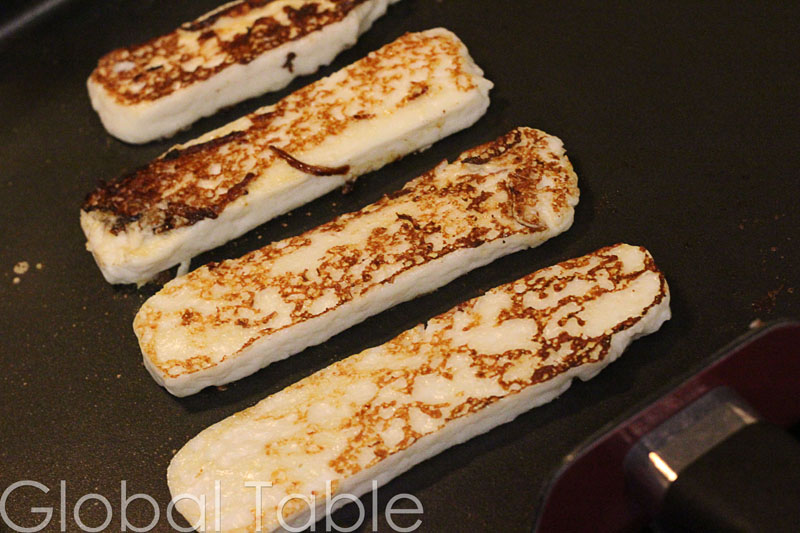 2. Meanwhile, fry cheese in a skillet over medium heat until both sides are golden brown (or darker, depending on your preferences)