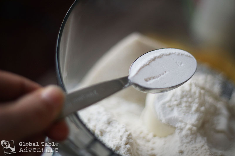 2. In the bowl of a food processor fitted with dough blade, add flour, sugar and baking powder. Pulse to combine.