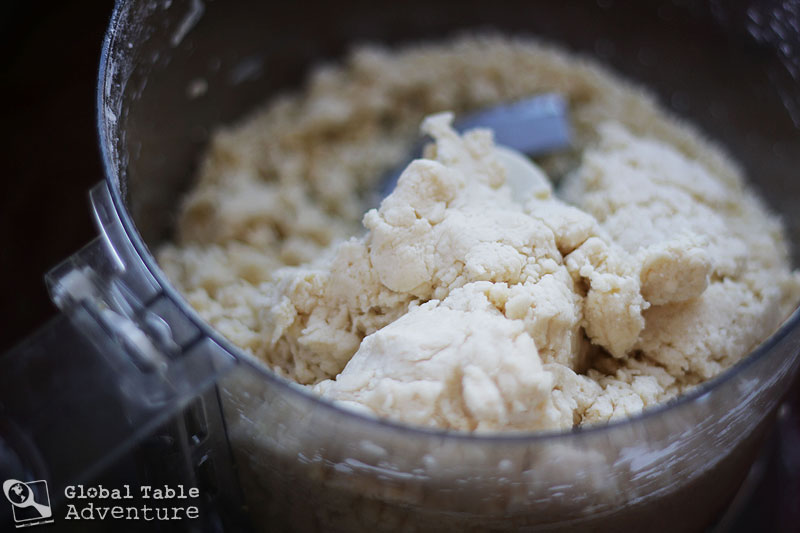 4. While pulsing, stream in the milk until a soft, shaggy dough forms one that can easily be pressed together into a ball.