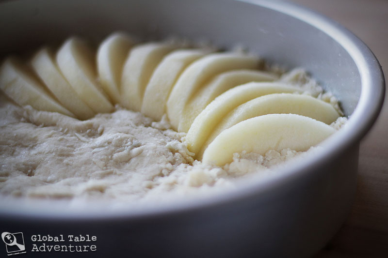 Take the dough and press it into a greased and floured 8″ cake pan. Then slice the apples …