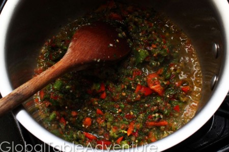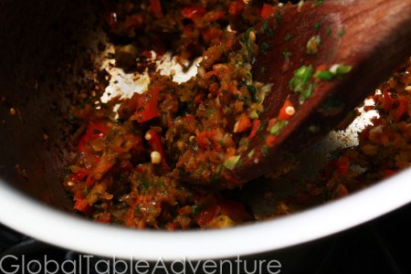 - Heat up some oil in a medium pot. Add sofrito and cook… past the point where it releases all its juices and it becomes browned.