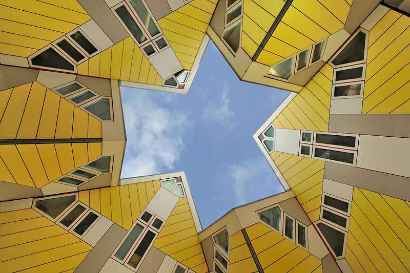 The Cube Houses in Rotterdam, The Netherlands viewed from Blaak Subway Station. Photo by Cmglee.