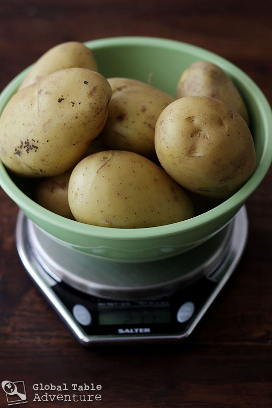 Now, weigh and wash the farm off your potatoes. Place them in cold, salted water and bring to a boil. Cook until tender.