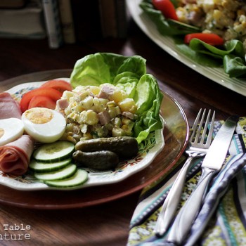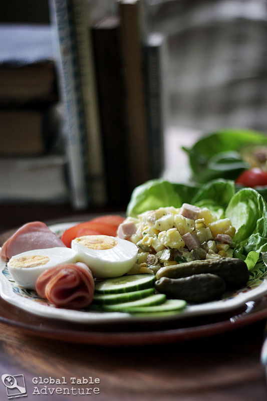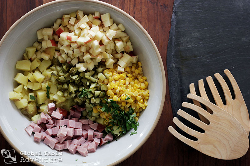 She’s full of bright, juicy apples, smoky cubes of ham steak, sweet corn, and tiny, salty gherkin slices. She’s an entire meal, surrounded by tender lettuce, hard-boiled eggs, cucumbers, tomatoes, more gherkins, and whatever else you’d like to nibble on.