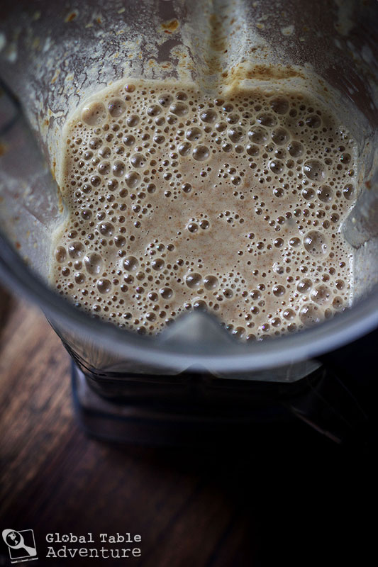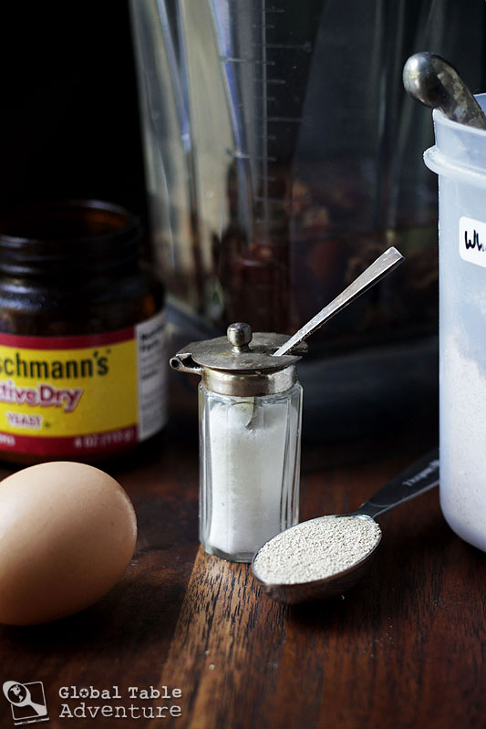 Give the blender a whir, until the dates and water make a smooth mixture. Then add in the eggs, flour, yeast, and salt.