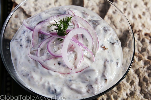 Give the mixture a stir, top with sliced onion and dill, and serve chilled with rye crackers.
