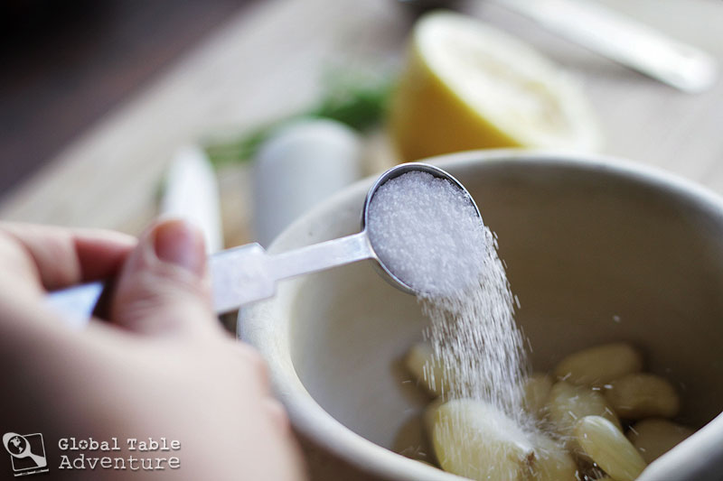 First, you have to get the garlic started. You can crush it with a garlic crusher, or chop, chop, chop it, or pound it with some salt with a mortar and pestle.