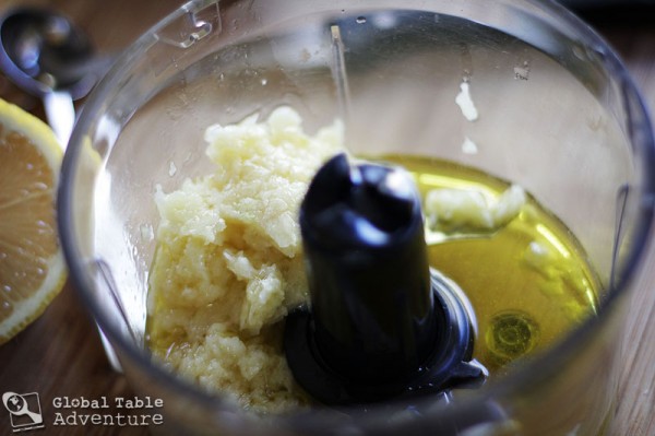 2. Add garlic to a small processor with olive oil and lemon juice. Puree until perfectly smooth.