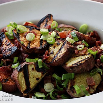 Today’s salad takes inspiration from New Zealand’s love of barbecue. For color I combined two kinds of sweet potatoes on the grill before tossing them with bacon, green onion, and a quick, zingy honey mustard dressing.