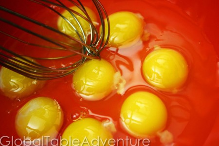 Then, crack 8 eggs into a large bowl and whisk until light and frothy.