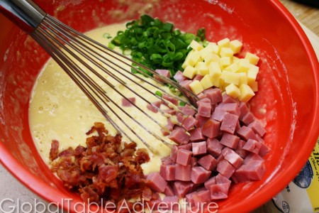 Pull out the whisk and put in a wooden spoon. Stir like mad… or until everything is combined. Like I said, cut your ham smaller and/or add a bit more flour so the ham doesn’t sink (but still maintaining a “batter” of sorts). Sinking ham makes me sad.