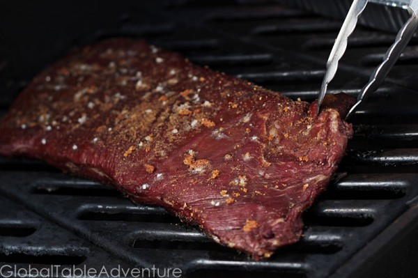- Place flank steak on grill and close. After an hour, flip and continue cooking.