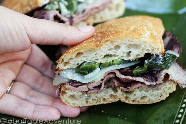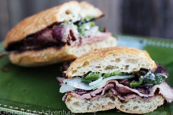 - Brush sliced baguette with oil and grill until toasted. Meanwhile, slice the meat thinly across the grain. Spread the baguette with a little mayo. Add on grilled poblano and onion strips. And top with thinly sliced meat. Enjoy!