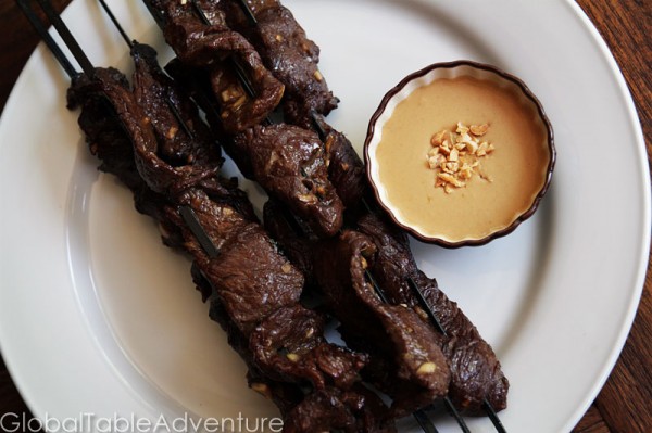 - After at least an hour (or up to 24), thread the meat onto skewers and grill over medium heat, turning once. Enjoy with peanut sauce.