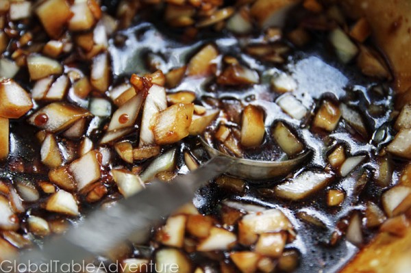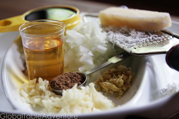 (clockwise from left to right): kecap manis (sweet soy sauce), onions, palm sugar (optional), ginger, chopped garlic, ground coriander, and peanut oil.