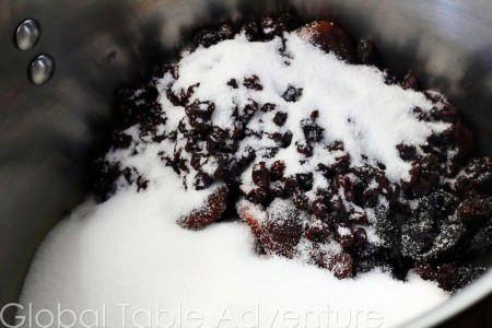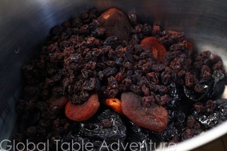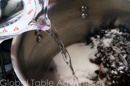 Add water to dissolve the sugar and pull out the flavors from the dried fruit.