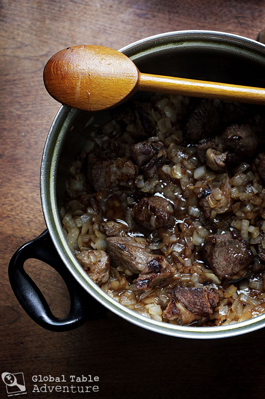 Stir in the onion and continue to cook. It might take a good ten minutes to get the onion soft and brown. By then your house will almost smell like glorious Tajikistan.