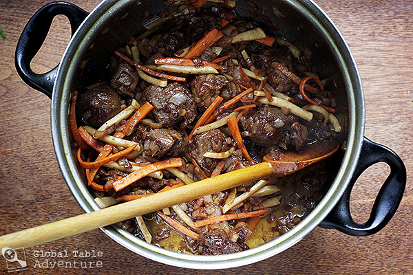 Next, brown the meat in the  vegetable oil. The recipe purposefully uses a lot of oil (traditionally, the fat would be from the mutton)… the oil gives the plov authentic, rich flavor that you’ll be craving for years to come.