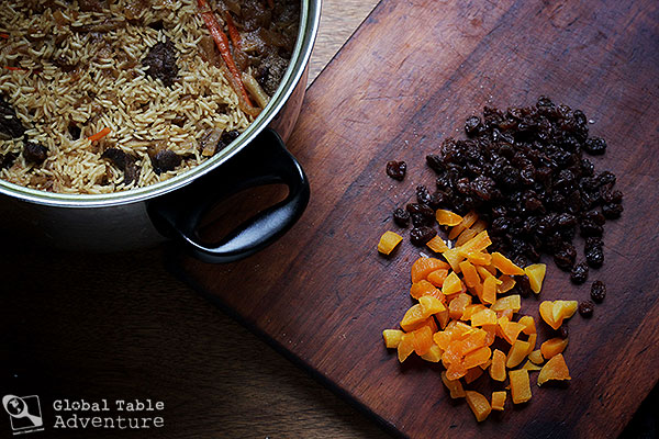 Add the hot water and rice to the lamb mixture. Simmer 15 minutes uncovered. Then add raisins and quartered dried apricots. Cover and remove from the flame. Let rest this way 10-15 minutes.