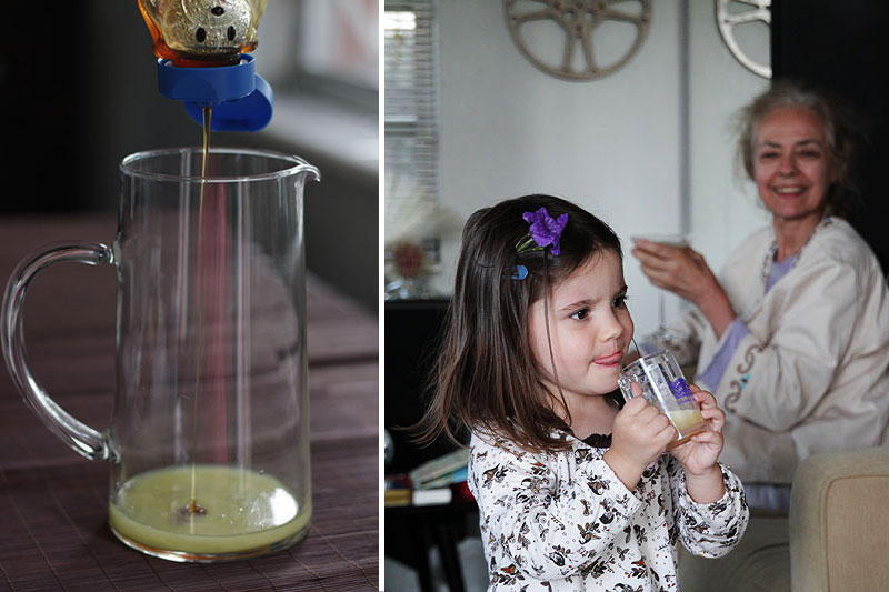 Mix 1 part ginger juice, 1.5 parts lime juice and 1-3 parts honey (to taste). Mix with lots of crushed ice… or blend the Lomi Lomi and ice together, like a frozen margherita. That’s what I did and it was yum!