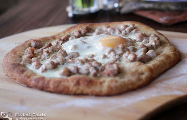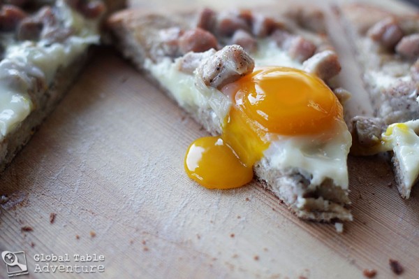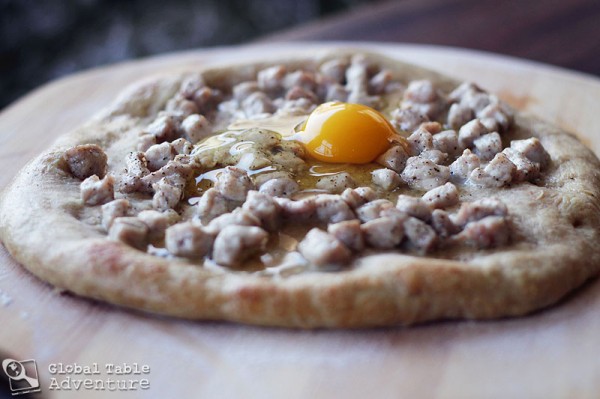 Also, you may wish to scramble the egg before pouring it over the pizza, an alternate preparation popular in Macedonia. As for the fat used, I used olive oil which is generally popular in the area, but some locals like to dot this pizza with lard instead, lending the pizza a much more indulgent quality. The choice is yours.