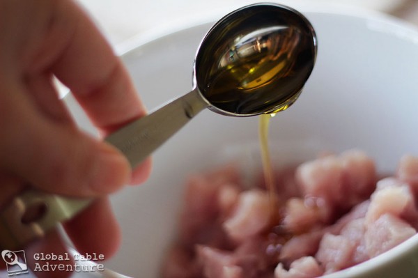 7. Toss the diced pork with olive oil, salt and pepper.