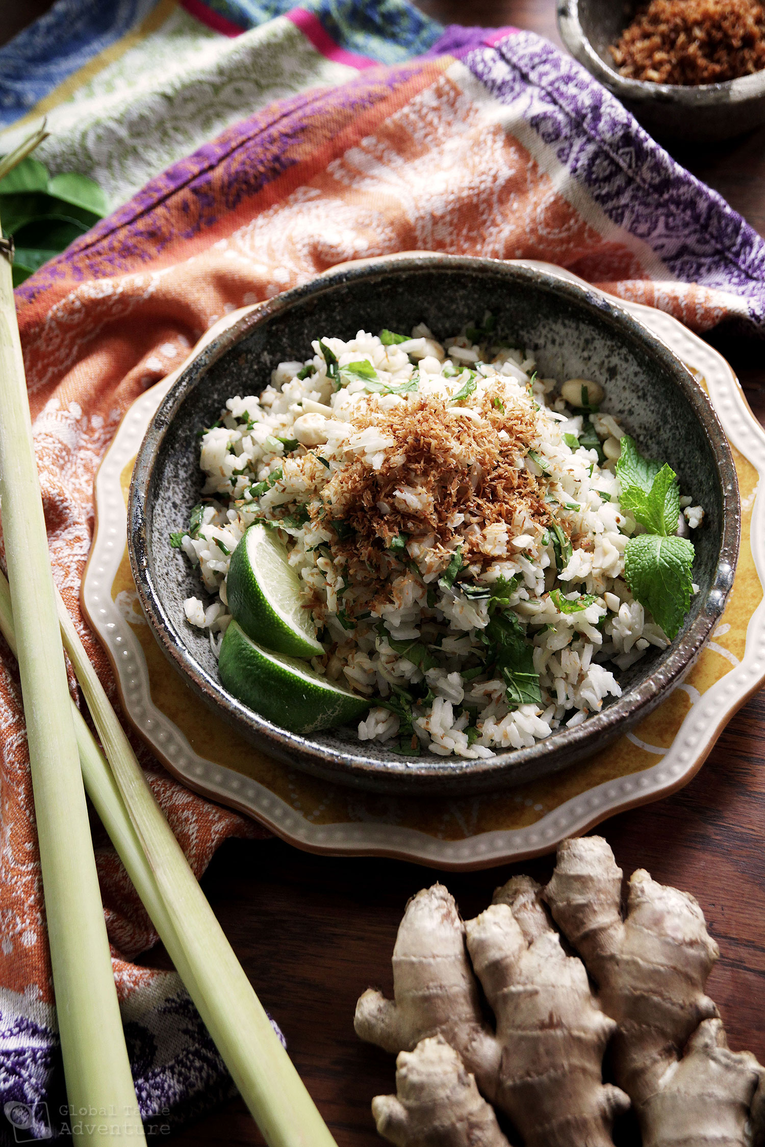 Traditional Malaysian Herbed Rice Salad recipes include dried shrimp but since Ava is vegetarian we’ve kept them off the ingredients list. Substitute some salt for the fish sauce if desired.