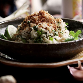 The benefits of making an herb salad start before the first bite: Slicing into the greenery blooms their scent into every nook and cranny. Shut your eyes and you might think you’ve wandered into a sprawling, secret garden. The bouquet is a whimsy of basil, mint, limes, lemongrass, basil, cilantro, chives, and kaffir lime leaves… A crush of garlic, ginger, fish sauce, peanuts, and toasted coconut seals the deal.