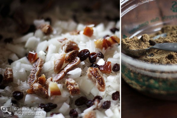 Chop the onion, dried fruits, and add to a skillet with rice, stock, salt, pepper and ground coriander. Cover and simmer for about 10 minutes. Enjoy the smell of sweet goodness.