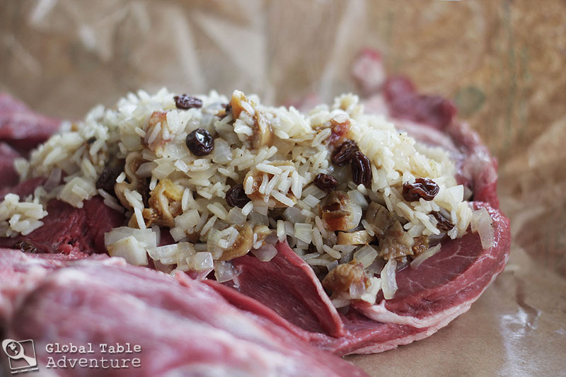3. If you choose to stuff the lamb, lay slightly cooled rice and fruit mixture along the meat. Reserve extra rice stuffing in a casserole to bake.