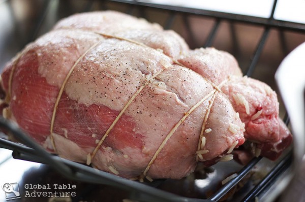 4. Roll the leg of lamb back up and tie with butchers twine.