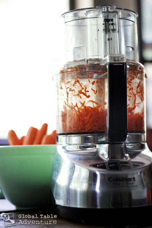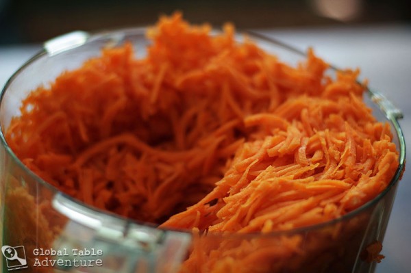- Peel a mountain of carrots and shred finely. I used my food processor, but the grater-feed has rather large holes. In Morocco, this salad would be almost pulverized and soupy. You can use the fine side of a box grater or pulse the shredded carrots a few times in the processor to make it finer than I did if you’d like to be more authentic.