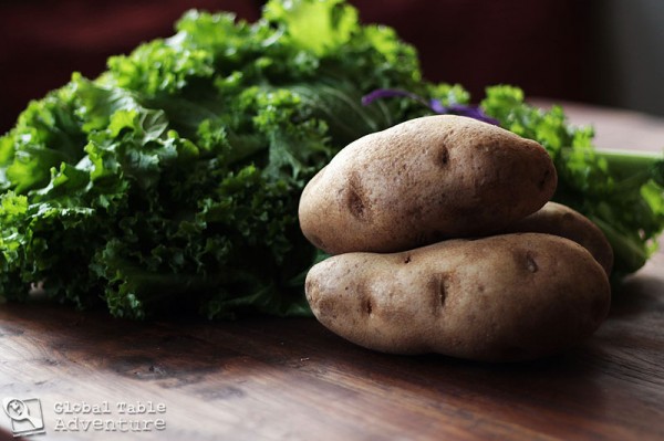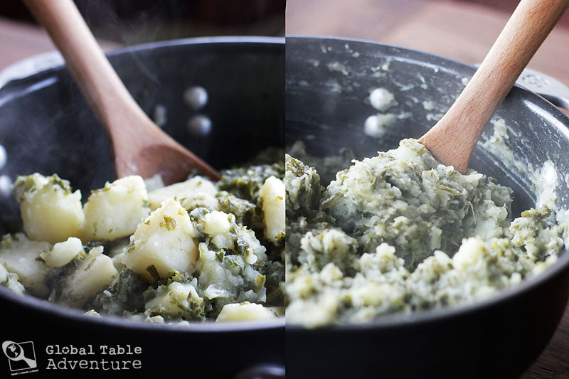 Typically, Moroko is made with onions and greens, sauteed in oil with a bit of broth, not unlike the Kale (Sukuma Wiki) we made recently for Kenya. Moroko can be made with any dark greens you’d like, such as kale, spinach, chard, or mustard greens. Optionally, beans or potatoes can be added. But I have a secret – the most wonderful mash around is when you add mustard greens to potatoes. And this mash, inspired by Lesotho, is what we’re serving up today.