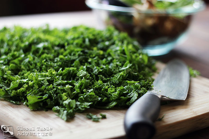 - Remove the tough stems from the mustard greens and chop the leaves finely.