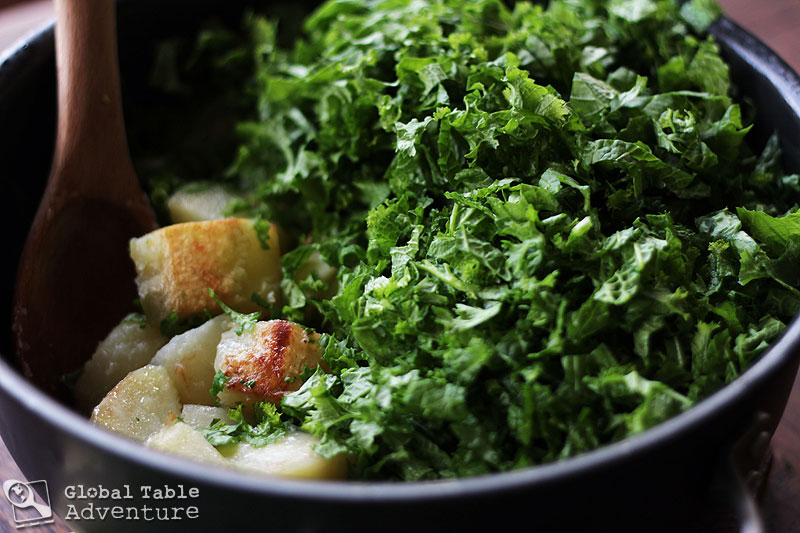 If you’d like, brown the potatoes in vegetable oil to add a bit more flavor. Then add the greens, stock, salt and pepper.